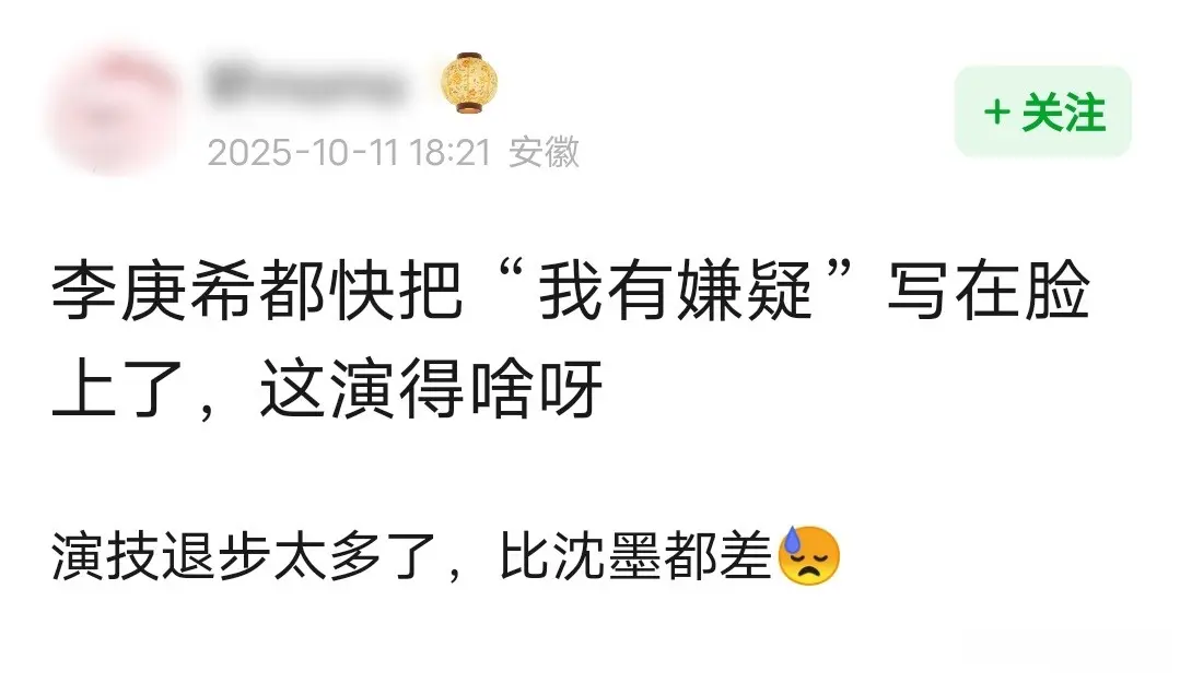 不过,目前观众对该剧的吐槽点不仅在于剧情上,而且女主李庚希的表现也备受争议,不少观众之所以选择弃剧,并非因为黄轩或张哲华的加入,而是因为李庚希的加盟,不论是她对角色的刻画还是她与角色之间的适配度,都引发不少网友的不满。