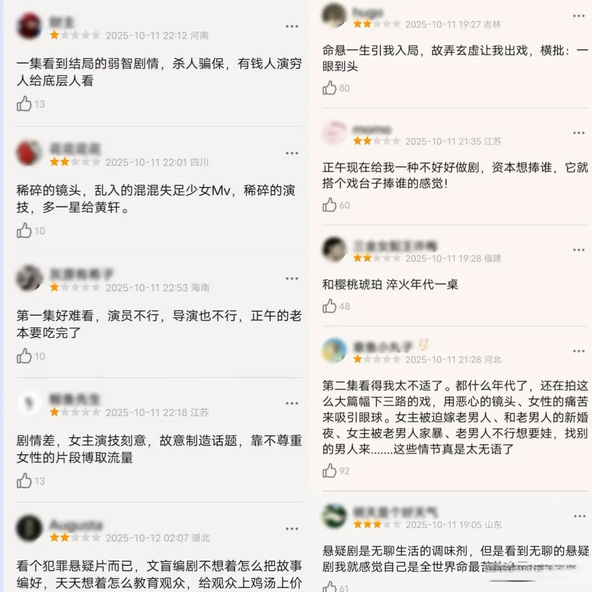 从评价中不难看出,许多观众把该剧比作是“低配版漫长的季节”,不仅剧情显得有些无聊,故事呈现方式也是故弄玄虚,实在让人出戏。而且有些镜头让人观感不适,用女性的痛苦来吸引眼球,这做法有些欠妥。